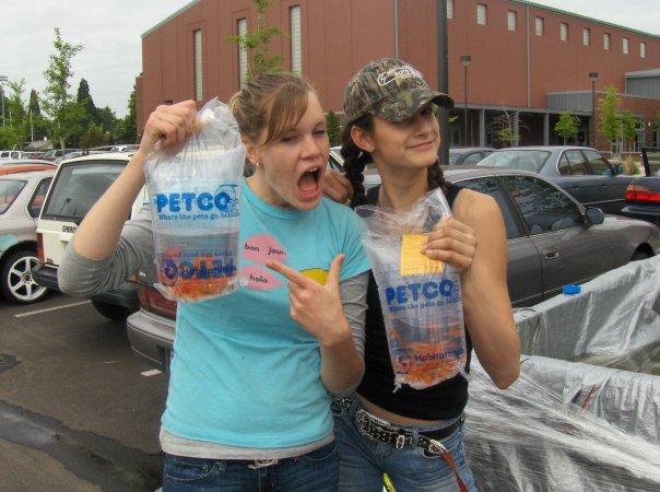 - The next prank was another car prank. A fun loving girl in the grade above us was dating one of our favorite auto shop partners named Ty. Ty had gotten poor Ali with some sort of prank so, in order to act the perfect revenge, she went to the best in the business: Katie and Lindsay. It took us quite a while and a lot of research to come up with the best plan for poor Ty but when we finally came up with it Unfortunate Teal (the name of his little Ford Ranger) never stood a chance. We planned the act during an off block and quickly went to work. We secured a large stretch of landscaping fabric to line the bed of his pickup. Then his friend Milan and I spent a good 20 truck loads hauling garbage cans full of water to his pickup. We decorated the bottom with river rock, put some swamp plants in and trailed them over the sides, floated a small cooler in the bag, put a fishing pole in the corner, and wrote “Gone Fishing” on the back window. That’s when Lindsay and Cory got back with the 200 feeder gold fish. Yes, we literally raised the stocks on Wall Street for feeder goldfish with one prank. We then hid in the swampy marshland on the outside of our parking lot while his carpool buddy Ip (okay his name was actually Phillip) sent Ty a text asking him if he could get his wallet out of the glove compartment of Unfortunate Teal because he had to return a book for a project at the library. He walked out…. and oh my gosh … the look on his face was beyond priceless. I remember cowering in the mud there, fist shoved in my mouth trying so hard not to give away our hiding spot by either busting out laughing or by wetting myself from laughing so hard. It was one of those moments where I couldn’t even look at my friends because I knew just one look at Lindsay and I would absolutely die in a fit of giggles. Unfortunate Teal became something of a celebrity that day. Pretty soon not a single car was parked around it in the parking lot and most of the school spent lunch break hanging around watching the fish and feeding them bread crumbs. Overall it was quite the riot! We even made a good deal out of it because we had brought boxes of Ziploc baggies and sold goldfish to people for a $1 a fish. Being feeder goldfish though, I knew they would be pretty quick to die because, besides the rare unicorn of the bunch, getting those suckers to live more than a week is virtually impossible. I will never forget though, how one of the many fish that died in the sun in the back of the pickup ended. It didn’t go down the gutter like the rest of the fish that didn’t make it through that day, Milan, in fact, SWALLOWED IT WHOLE ON A DARE! For lunch. He swallowed it whole for LOCAL BOYZ (but Local Boyz is pretty darn delicious). I still have that charming video, from a very old, poor quality flip phone, that I will always cherish as one of those quality high school memories.