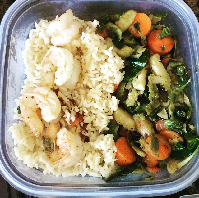 6. I had two different types of protein: shrimp & chicken. For the shrimp, I placed them in a non-stick frying pan with EVOO, lemon juice, and Flavor God’s Lemon & Pepper seasoning (basil, parsley, and oregano for the substitute). Cook them until they are just barely pink all the way through; nothing is worse than dry shrimp *blech*! For the chicken I cheated and will get an organic rotisserie chicken, this can be picked up at the rodeo (from a local grocery store obviously) and then deconstructed while warm and delicious into your re-heated veggies and rice. So easy right?