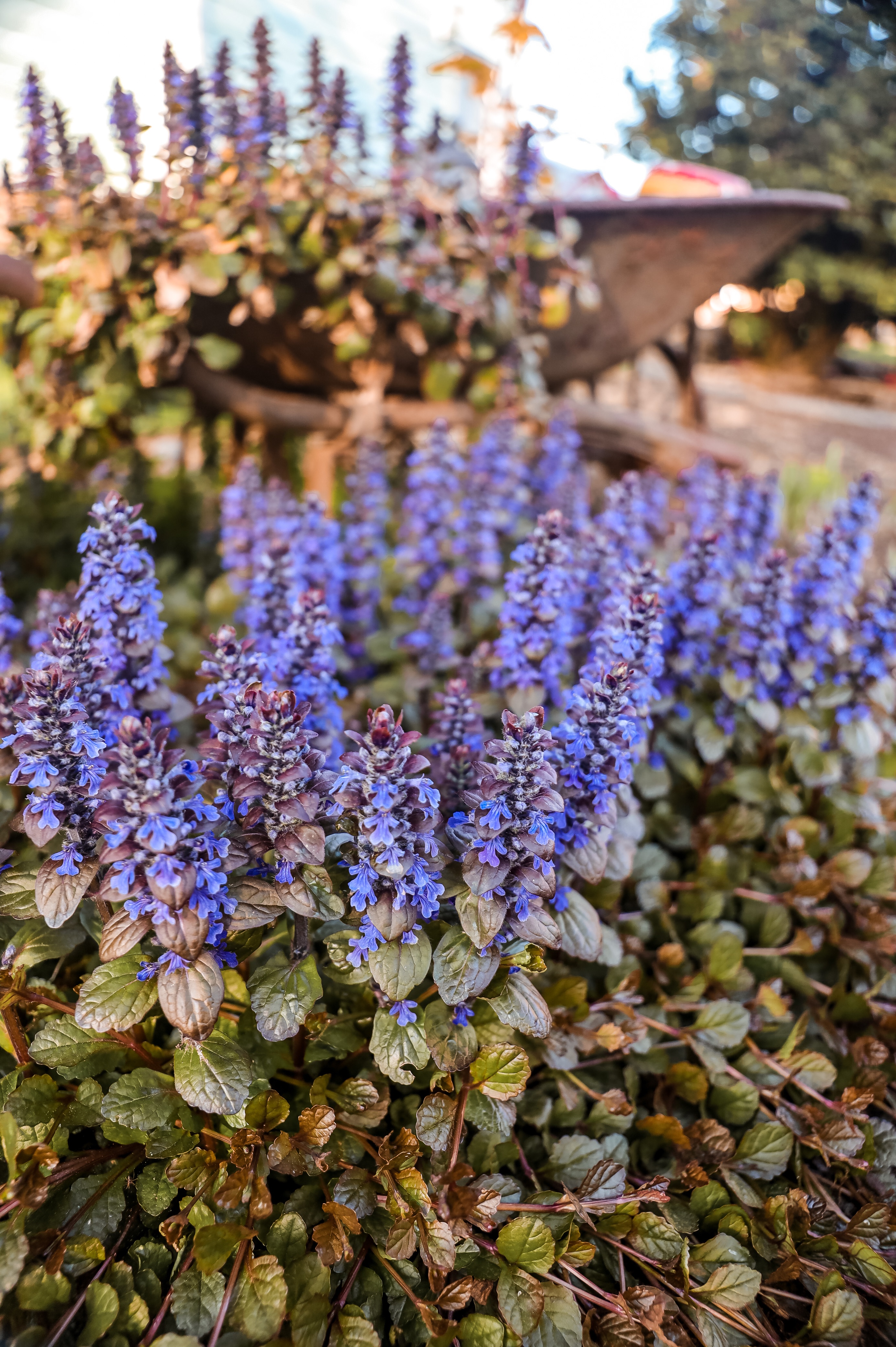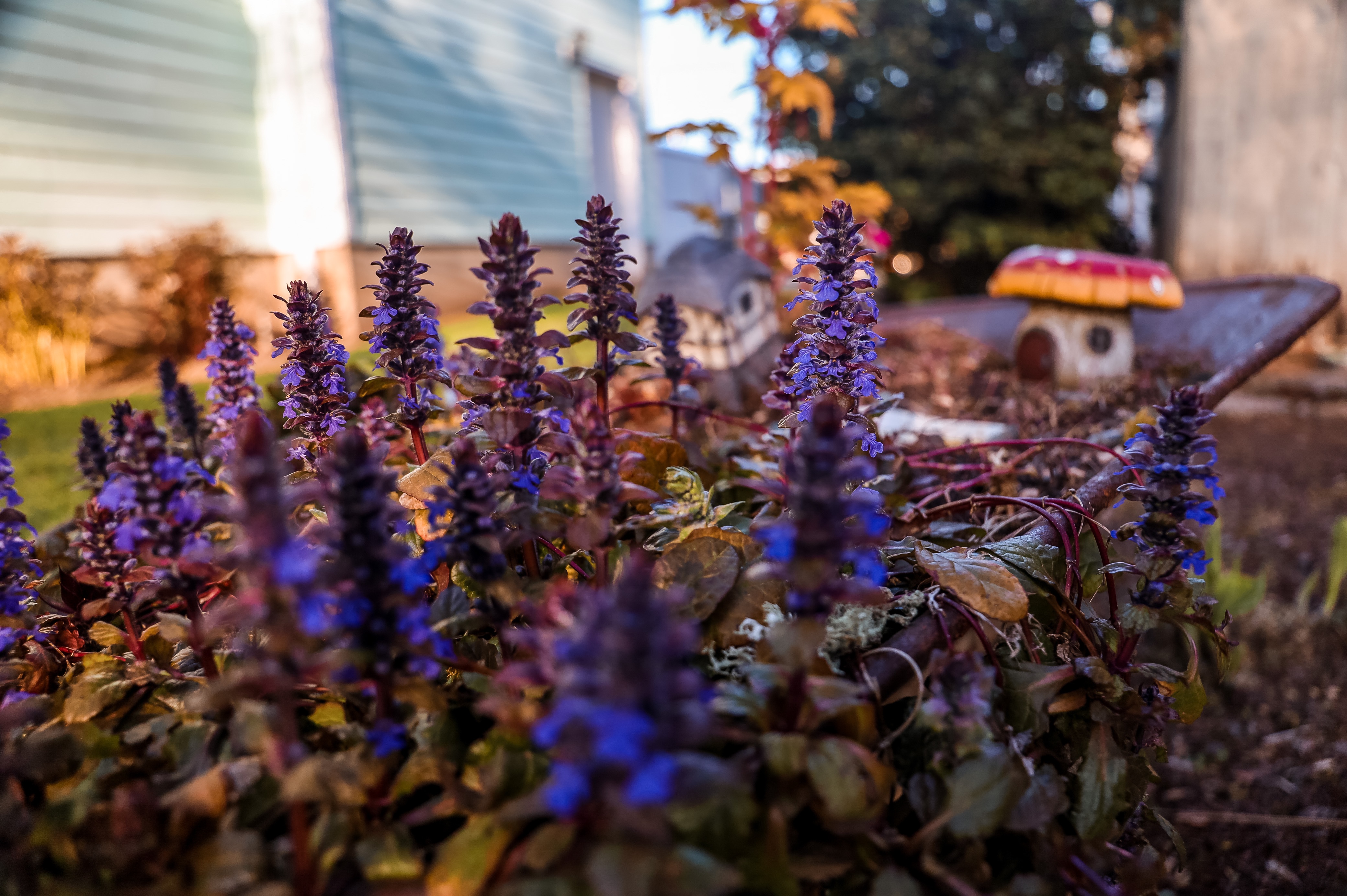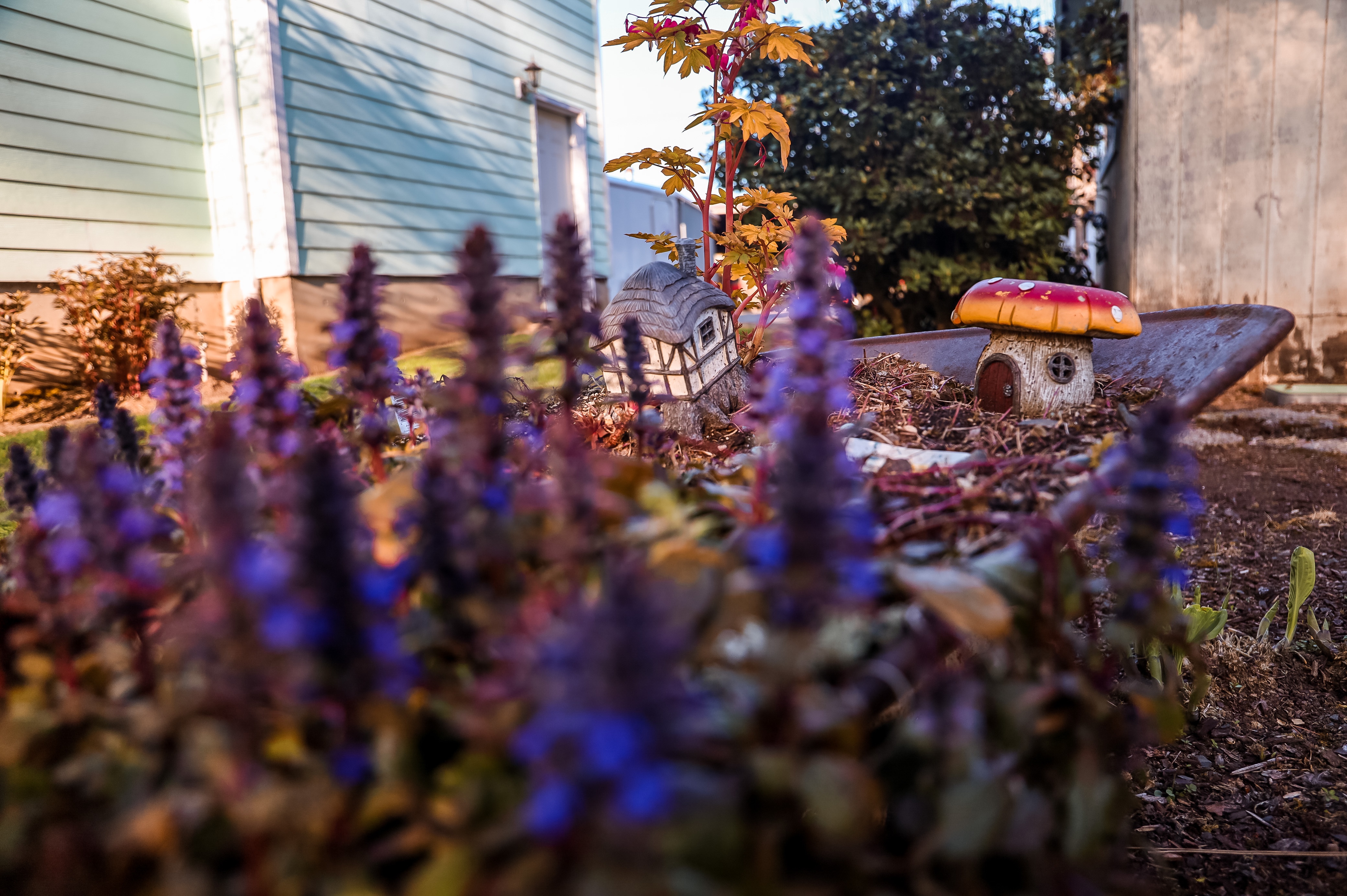 Looking for the perfect pop of color in the witching hour, I found some purple that caught my eye. I couldn’t help but laugh as I remembered the fairy garden my sister orchestrated for Mother’s Day years ago – the remnants still hanging out in an old rusty wheelbarrow.